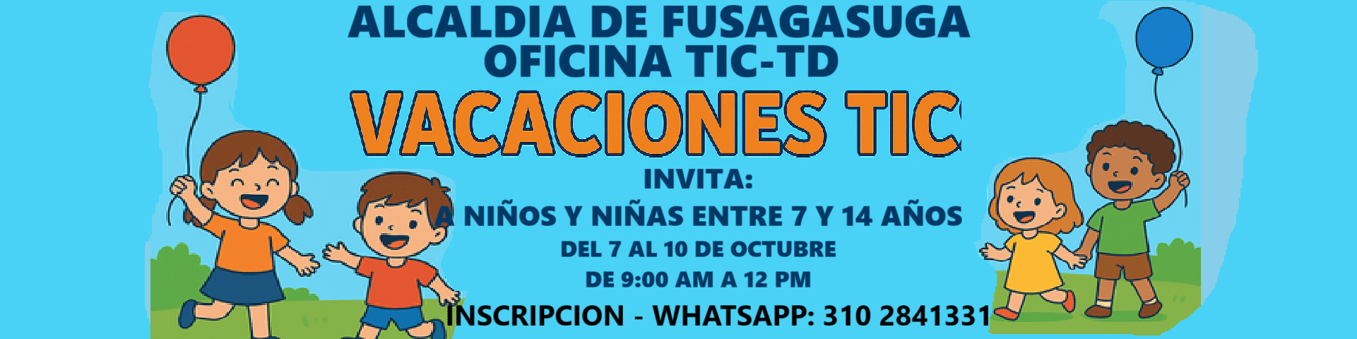 La Alcaldía de Fusagasugá, a través de la Oficina TIC-TD, extiende una gran invitación para todos los niños y niñas entre los 6 y 14 años, quienes están cordialmente invitados a celebrar sus vacaciones en una actividad totalmente gratuita, donde podrán disfrutar, compartir su tiempo libre y vivir momentos de alegría. Solo necesitan traer disposición, actitud y muchas ganas de divertirse; si lo desean, también pueden traer sus onces, aunque al finalizar la jornada tendremos un compartir especial para todos.